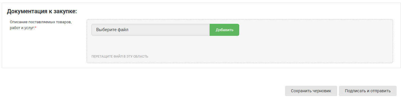 На данном этапе поставщику необходимо загрузить документ с описанием поставляемых товаров, работ и услуг и нажать кнопку Подписать и отправить.