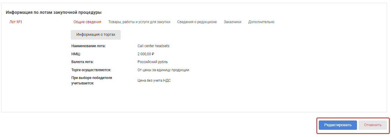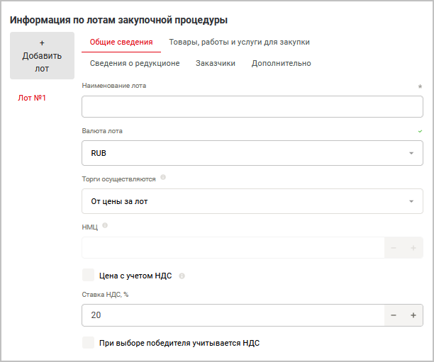 Добавить лот — позволяет добавлять несколько лотов в торге. При этом каждый лот может настраиваться отдельно (например, наличие/отсутствие НДС, приглашение разных заказчиков и проч.).