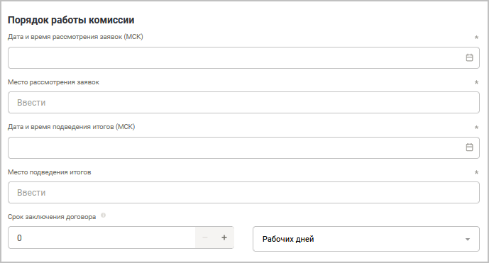 Место рассмотрения заявок — местоположение комиссии, заводится в произвольной форме.