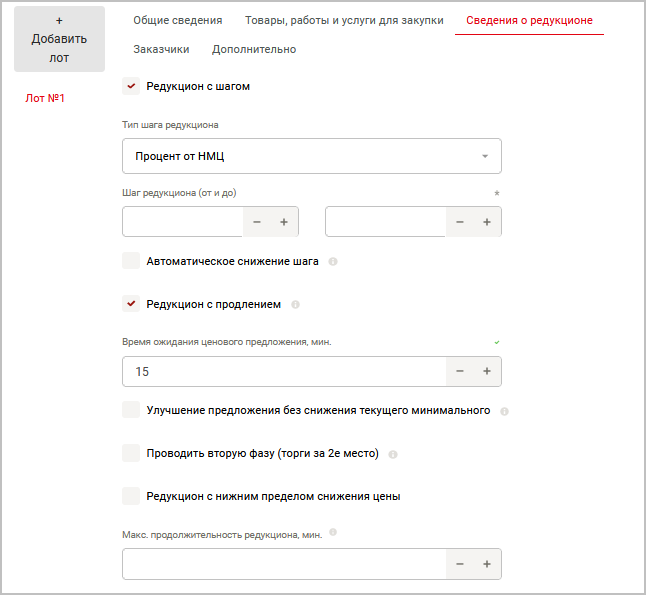 Редукцион с шагом — при выборе данного чекбокса поставщик должен будет снижать ставку только на заданный интервал (в противном случае будет выводиться ошибка).