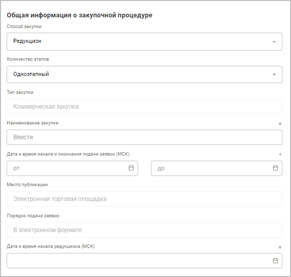 Способ закупки — для торгов на понижение цены оставьте пункт Редукцион. Информация по другим торгам описана в соответствующих разделах справки.