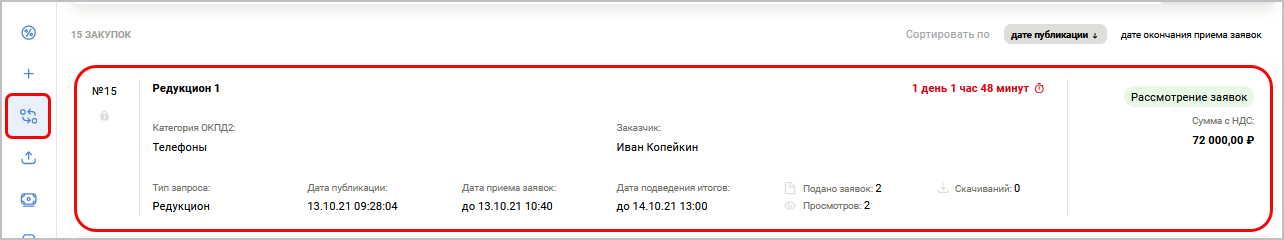 Дата и время рассмотрения заявок (МСК) — московское время начала рассмотрения заявок. На этом этапе покупатель проверяет документы поставщиков и может отклонить участника.