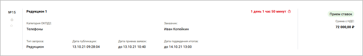 При переходе торгов в статус Прием ставок поставщики могут в режиме реального времени предлагать свои ставки на понижение цены товара.