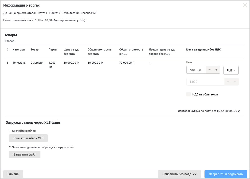 Загрузка списка товаров, работ и услуг через XLS файл — (отображается при выборе От цены за единицу продукции, см. выше) расшифровка к торгам. Расшифровка подается в виде обычного предложения в таблице. Поставщики указывают цены по каждому товару вручную или загружают из файла. Итоговая сумма должна совпасть с той, которую они указывали на предыдущем этапе. Если она не совпадет, то предложение будет отклонено. Если расшифровка не подается за 24 часа, то предложение поставщика аннулируется.
