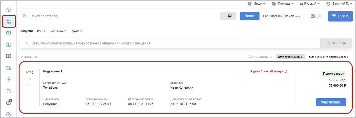 Чтобы просмотреть запрос и подать на него заявку, в личном кабинете поставщика нажмите на кнопку в меню слева. Отобразится список с закупками: