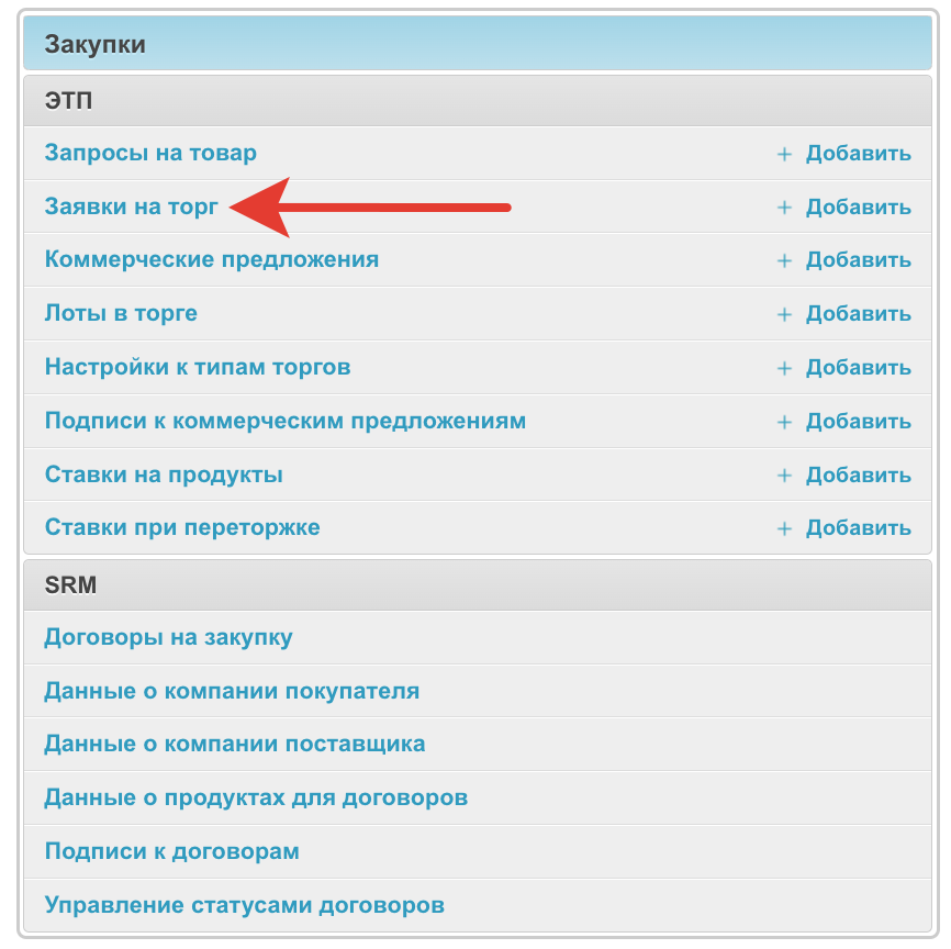 Чтобы открыть данный раздел, в административной панели  нажмите Заявки на торг.