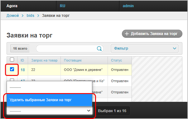 Если есть необходимость удалить какие-либо заявки, то выделите их и внизу выберите Удалить выбранные Заявки на торг: