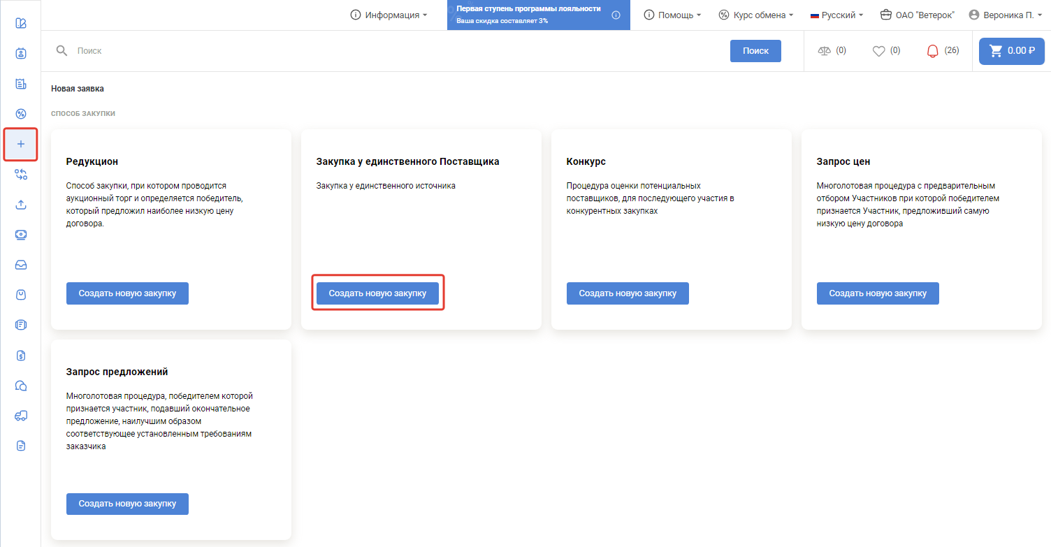Для оформления запроса в личном кабинете покупателя нажмите в левом меню кнопку . На появившейся странице подведите курсор к области Закупка у единственного источника и нажмите кнопку Создать новую закупку: