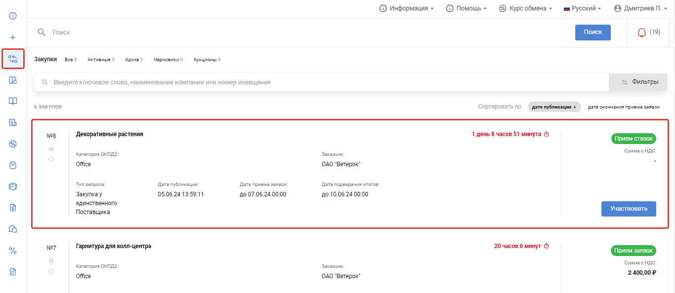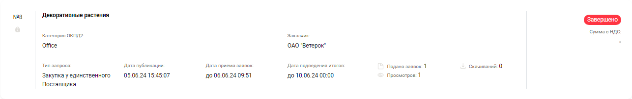 Чтобы просмотреть запрос, в личном кабинете поставщика нажмите на кнопку в меню слева. Отобразится список с закупками: