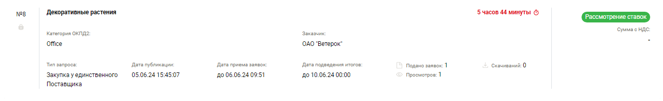 В разделе Заявки личного кабинета покупатель может нажать на данный торг, чтобы посмотреть предложение и цену откликнувшегося поставщика: