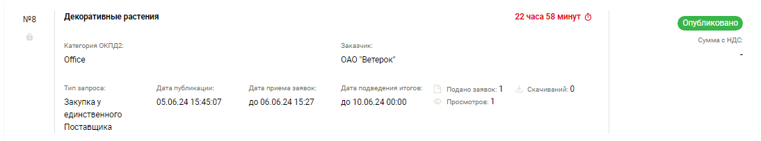 Если заявка опубликована покупателем, но еще не наступил срок приема ставок, заявка имеет статус Опубликовано, на данном этапе поставщики могут только просматривать запросы покупателя.
