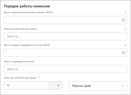 Дата и время рассмотрения заявок (МСК) — укажите московское время начала рассмотрения заявок. Обратите внимание, что удалить заявку поставщика можно только до заведенного времени, поэтому рекомендуется оставлять некоторое время после окончания подачи заявок (см. выше).