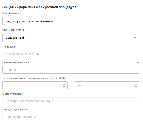 Тип закупки — по умолчанию отображается коммерческая закупка.