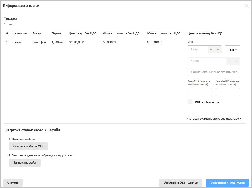 Без указания НМЦ — при выборе чекбокса сумма всех товаров в лоте указываться не будет.