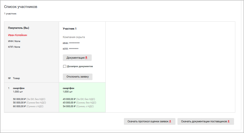 В это время для покупателя и поставщиков также формируется протокол рассмотрения заявок (содержит данные обо всех поступивших предложениях и их рассмотрении).