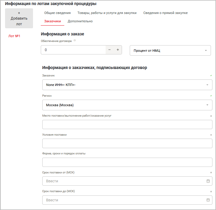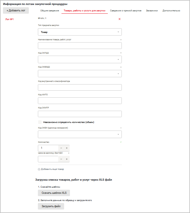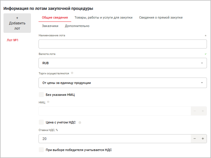 Добавить лот — позволяет добавлять несколько лотов в торге. При этом каждый лот может настраиваться отдельно (напр., наличие/отсутствие НДС, приглашение разных заказчиков и проч.).
