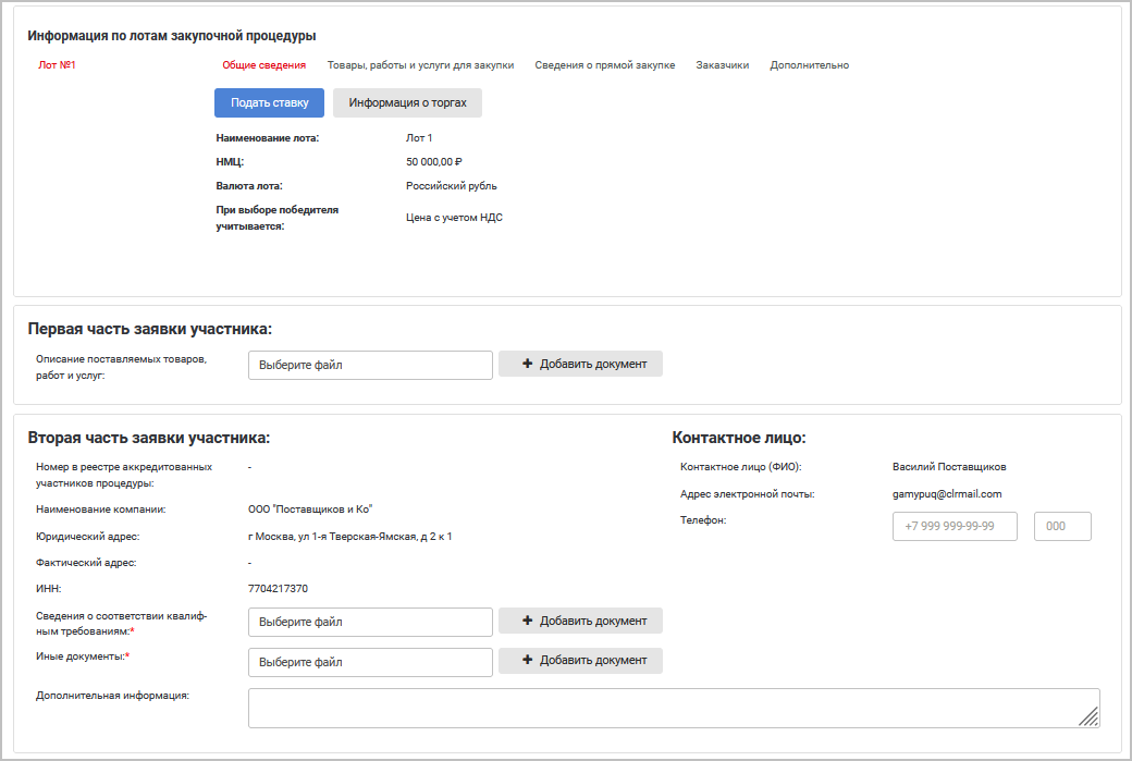 ФИО контактного лица — фамилия, имя, отчество покупателя, который оформляет заявку на торги.