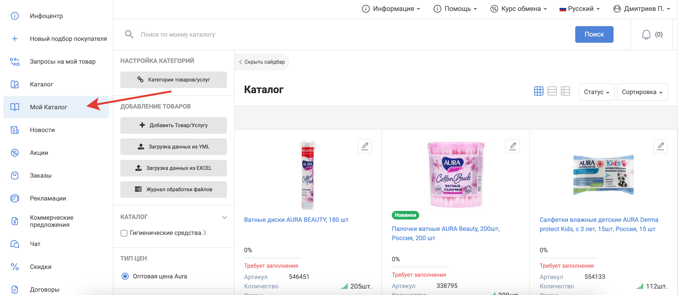 В разделе Мой каталог личного кабинета поставщик может загрузить отдельные товары или готовые прайс-листы в форматах YML, XML.