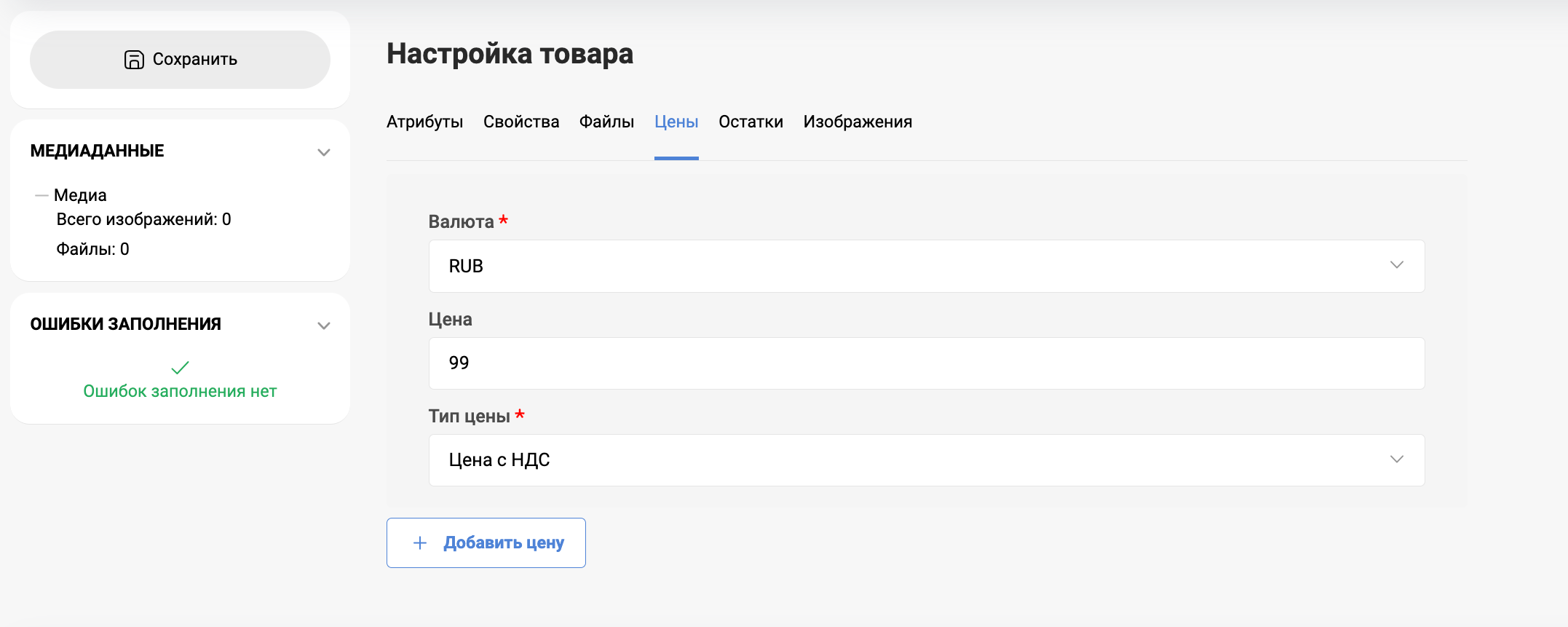 По кнопке Добавить цену можно добавить несколько значений для разных типов цен для товара. Таким образом, в зависимости от выбранного типа цены значение цены на товар будет отличаться.