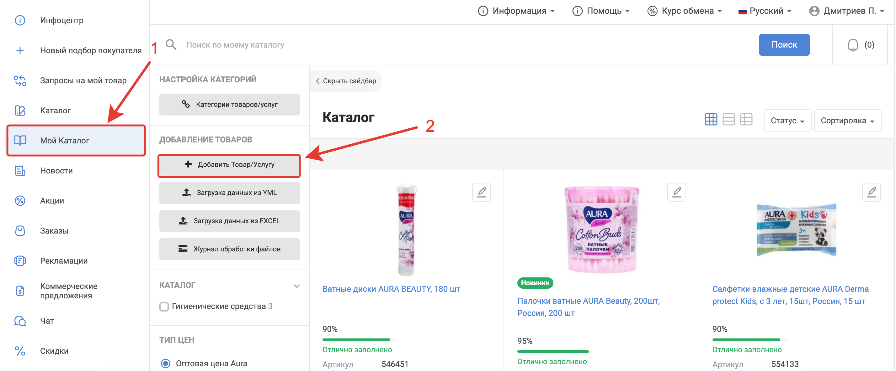 Чтобы создать карточку товара вручную, в личном кабинете поставщика перейдите в раздел Мой каталог и нажмите кнопку Добавить Товар/Услугу.