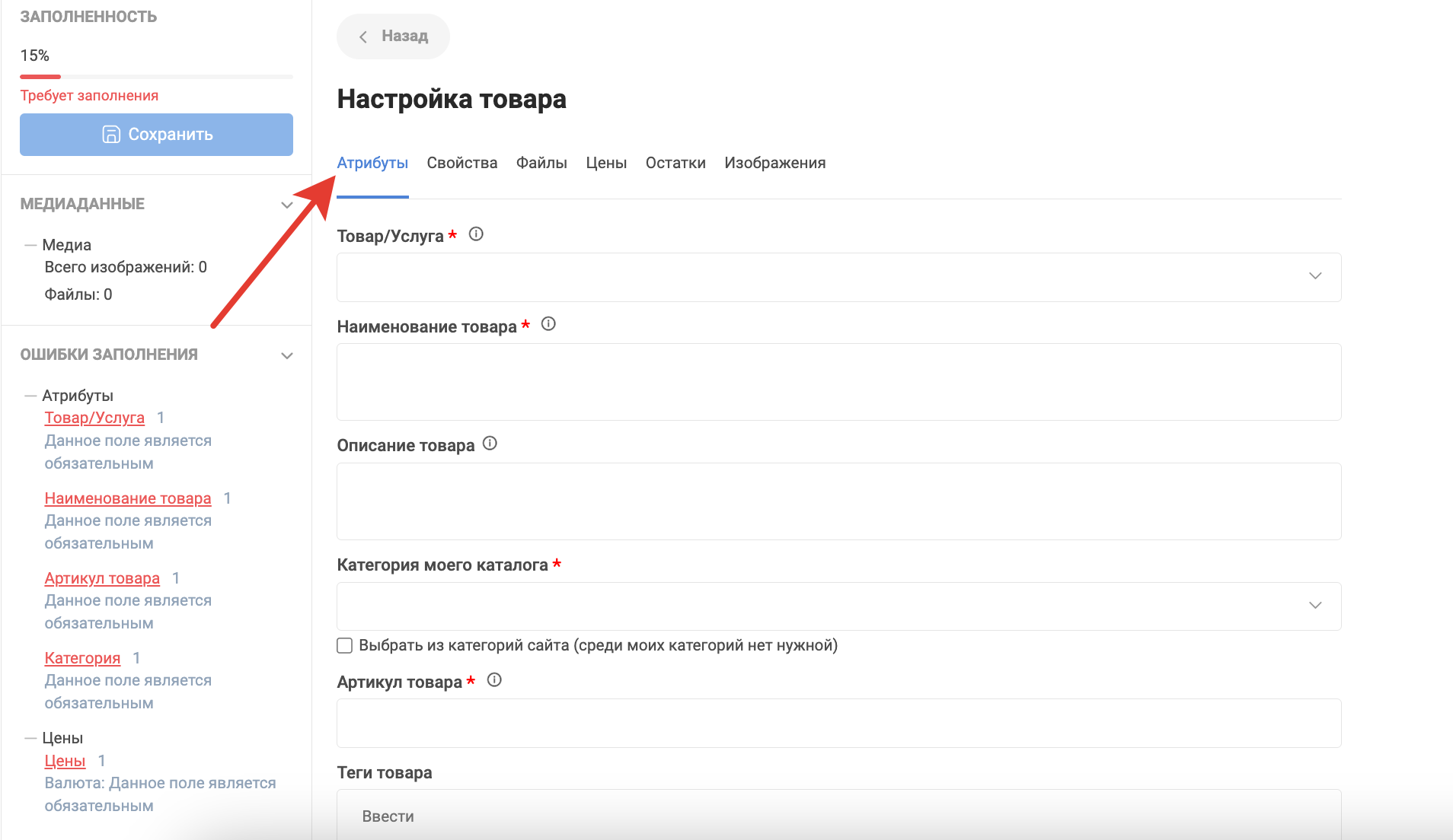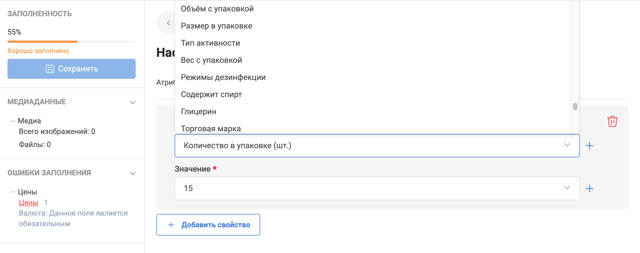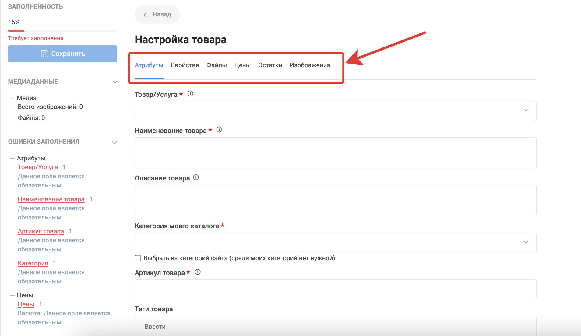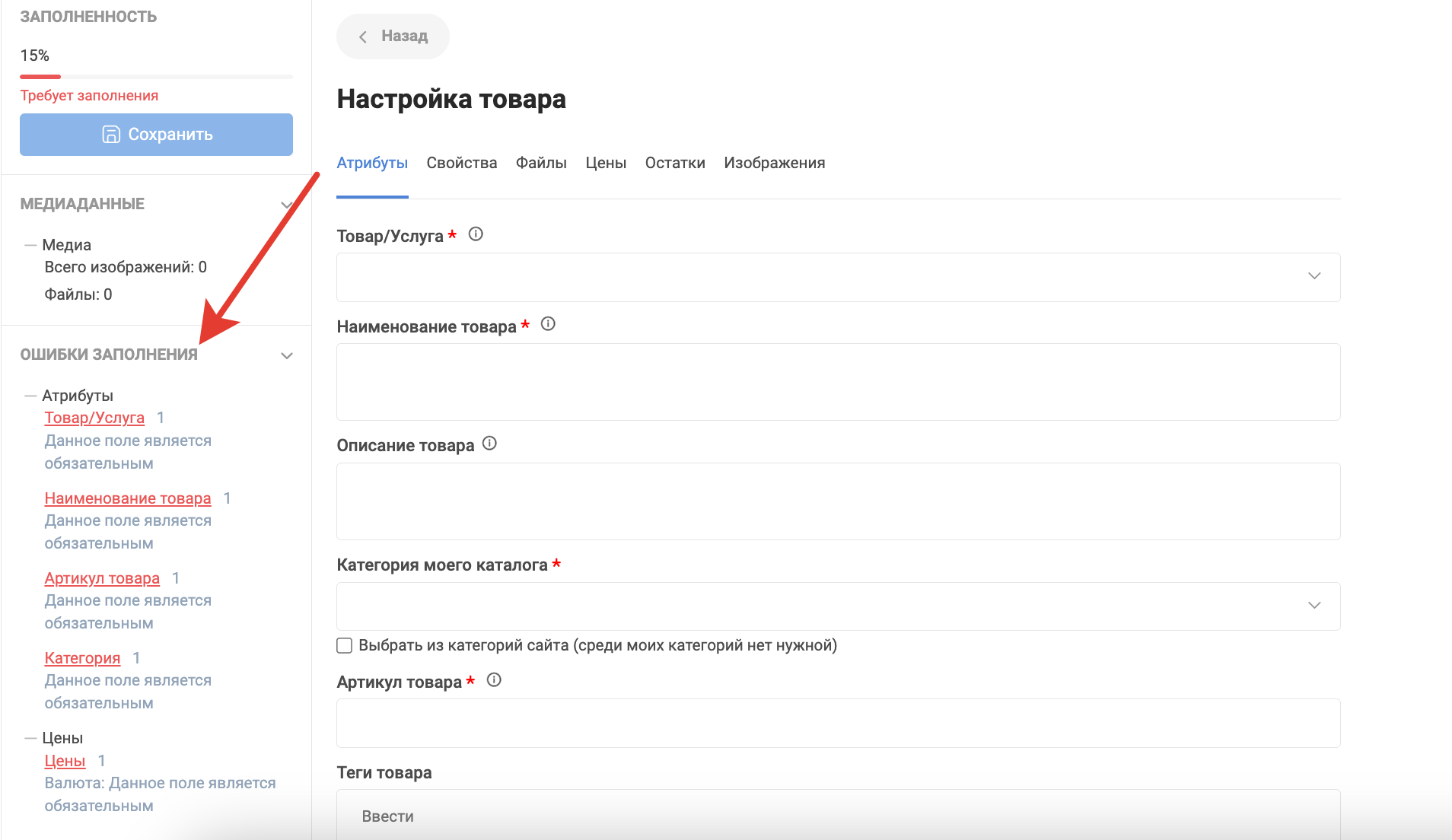 После этого откроется форма для добавления товара. В левой части окна будет указан процент заполнения карточки товара, а ниже информация по медиаданным, а также в блоке Ошибки заполнения можно увидеть, какие атрибуты обязательно нужно заполнить для добавления товара. Обязательные для заполнения поля отмечены красной звездочкой.