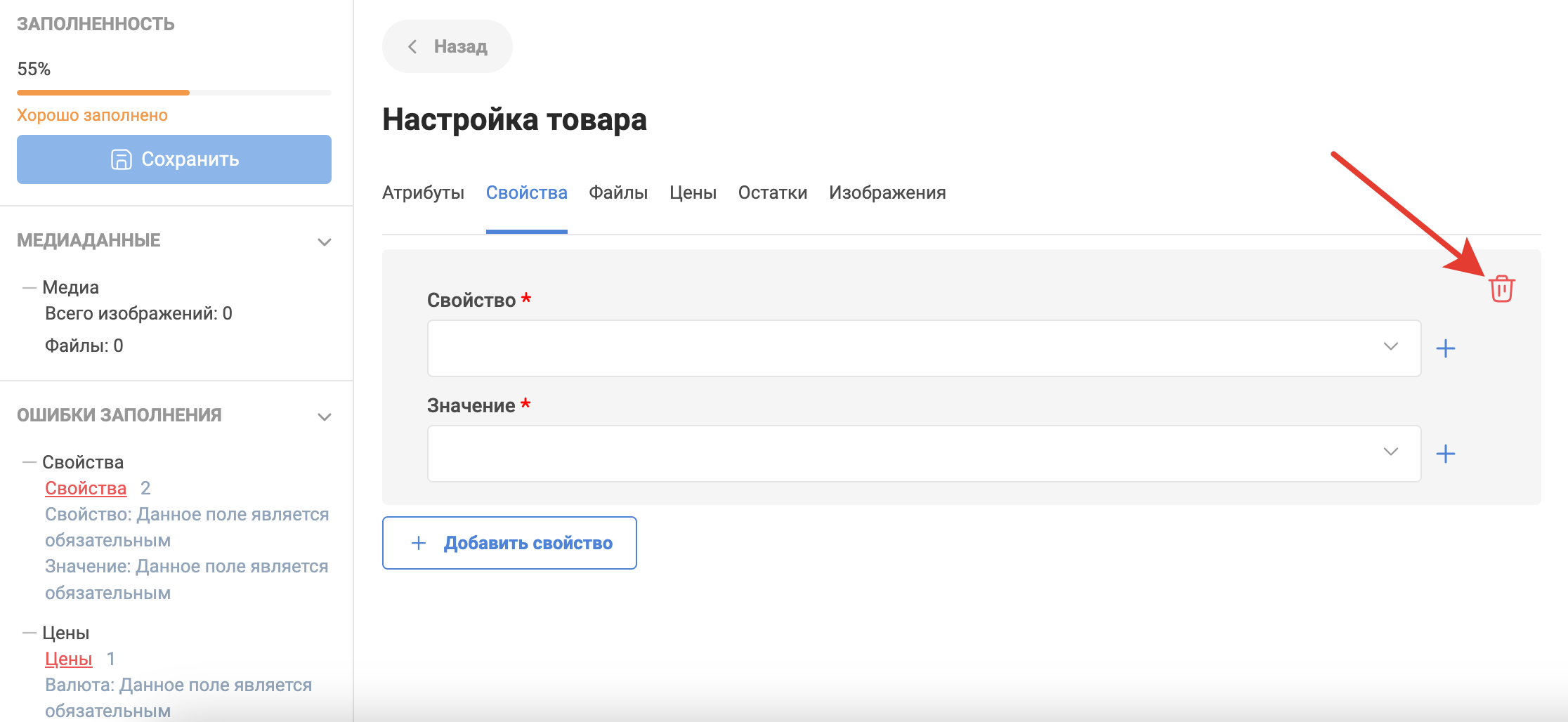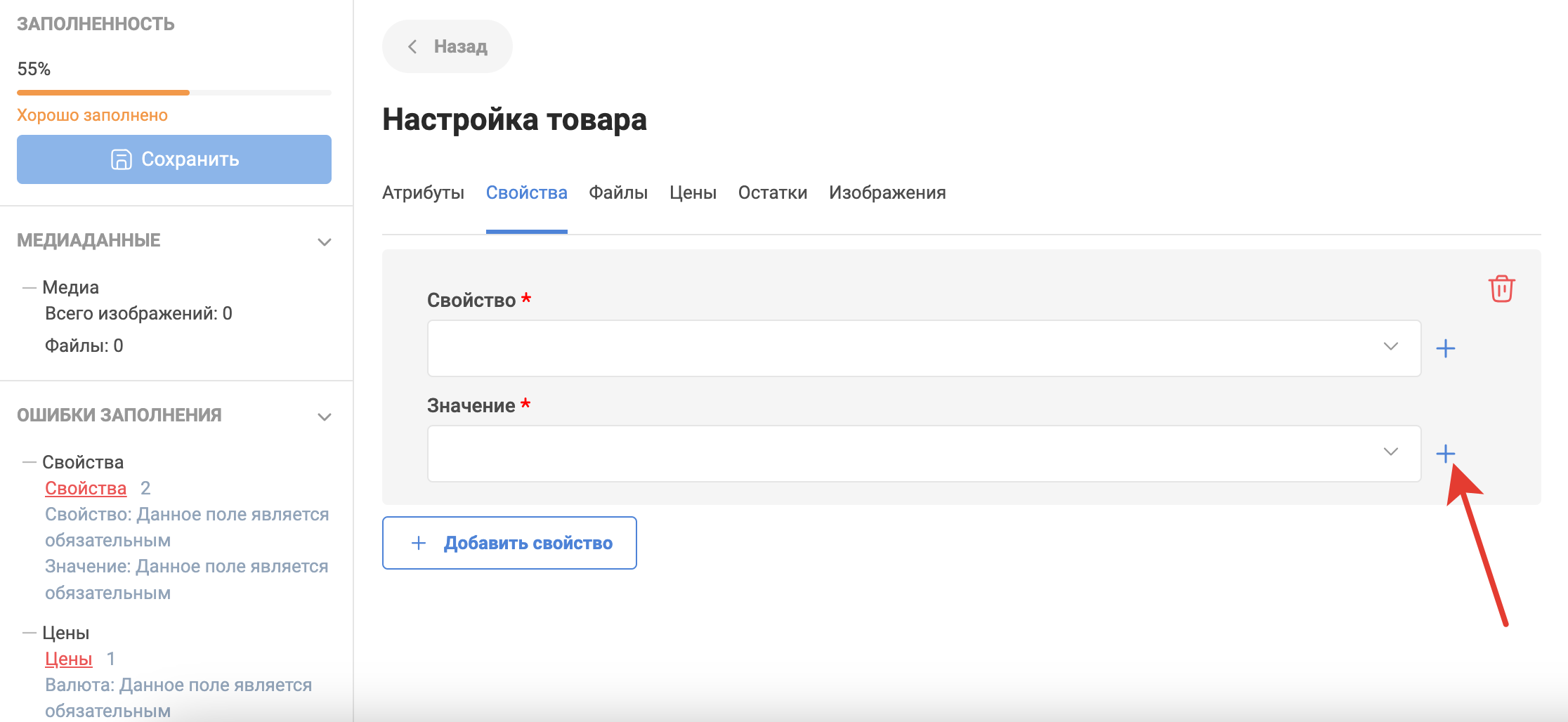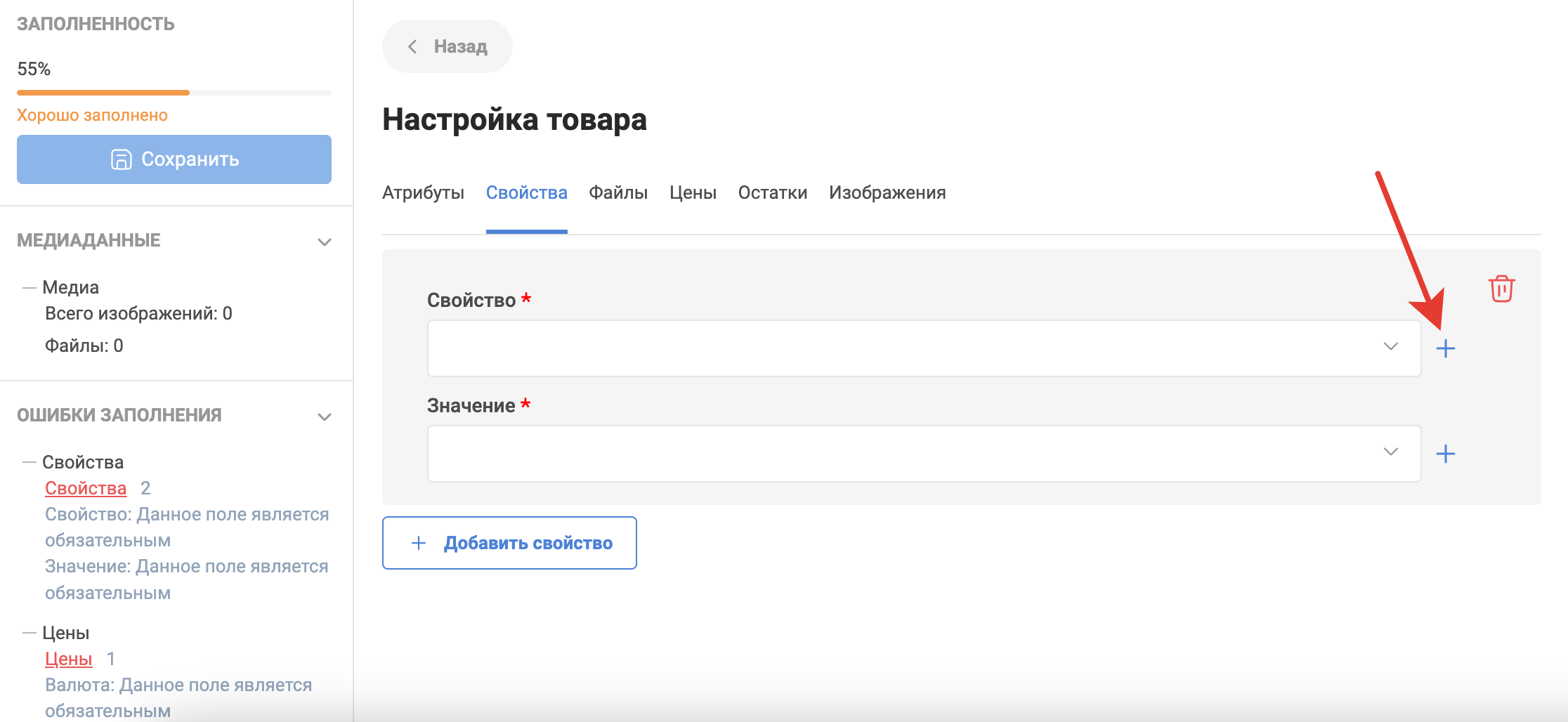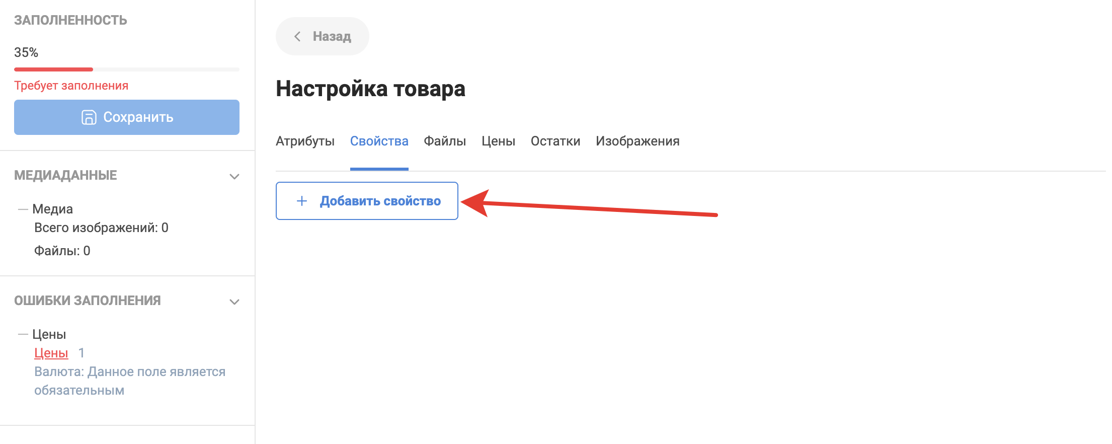 На вкладке Свойства можно добавить необходимые для товара свойства. Для этого нужно нажать на кнопку Добавить свойство.