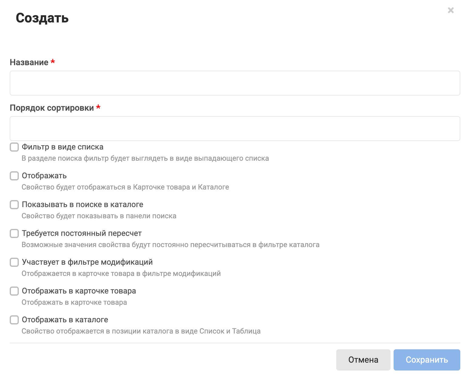 Отображать — эта настройка отвечает за отображение свойства в каталоге и карточке товара. Если свойство не должно выводится, то достаточно снять чекбокс.