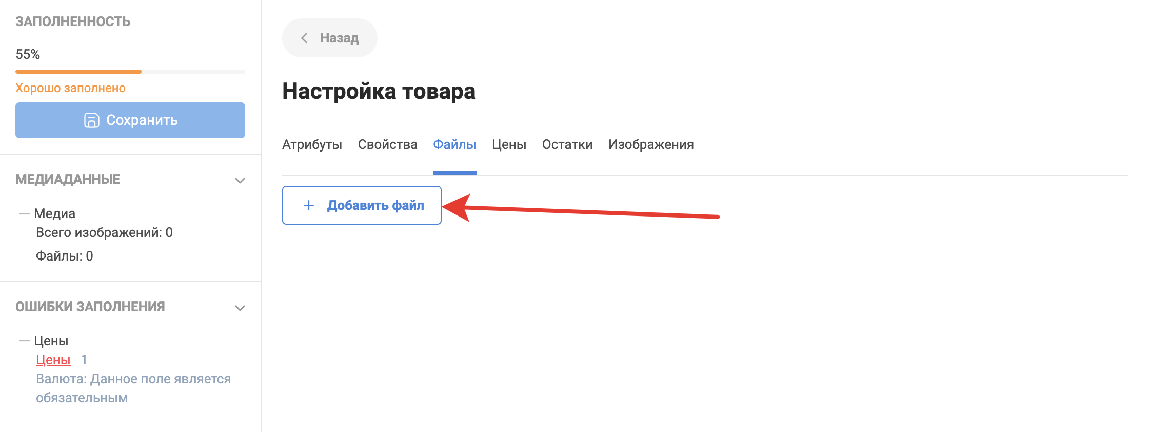 На вкладке Файлы существует возможность добавить дополнительные файлы, такие как Сертификаты, Спецификации, Инструкции и любые другие файлы, которые должны быть отображены конечному пользователю в продуктовой карточке. Для добавления файла нужно нажать на кнопку Добавить файл, а далее выбрать его на локальном компьютере.