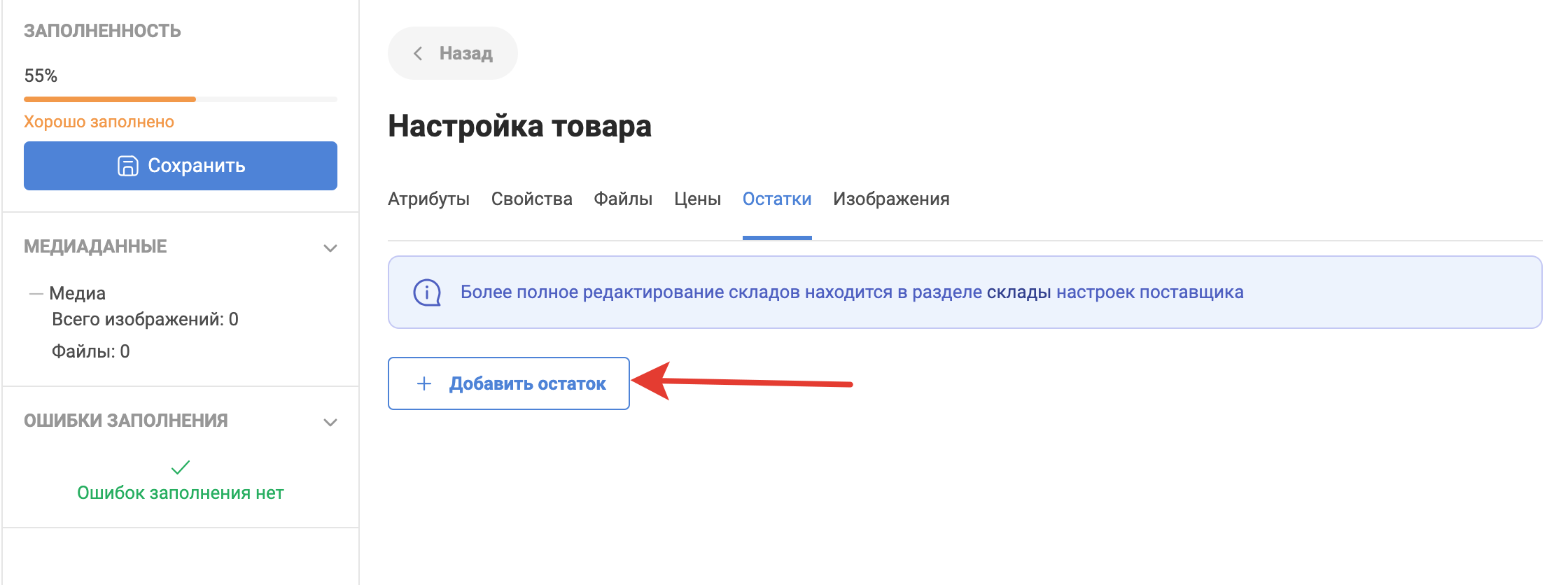 На вкладке Остатки можно указать остатки по товару на конкретных складах. Для этого нужно нажать на кнопку Добавить остаток.