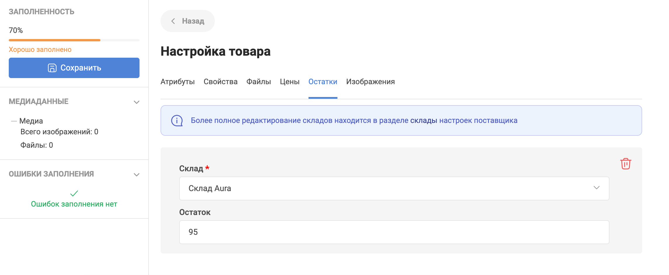 После этого выберите склад из списка, который вы ранее создавали на этапе настроек профиля, и укажите остаток на этом складе. Если товар числится на нескольких складах, то по кнопке Добавить остаток можно указать остатки на других складах по этой позиции.