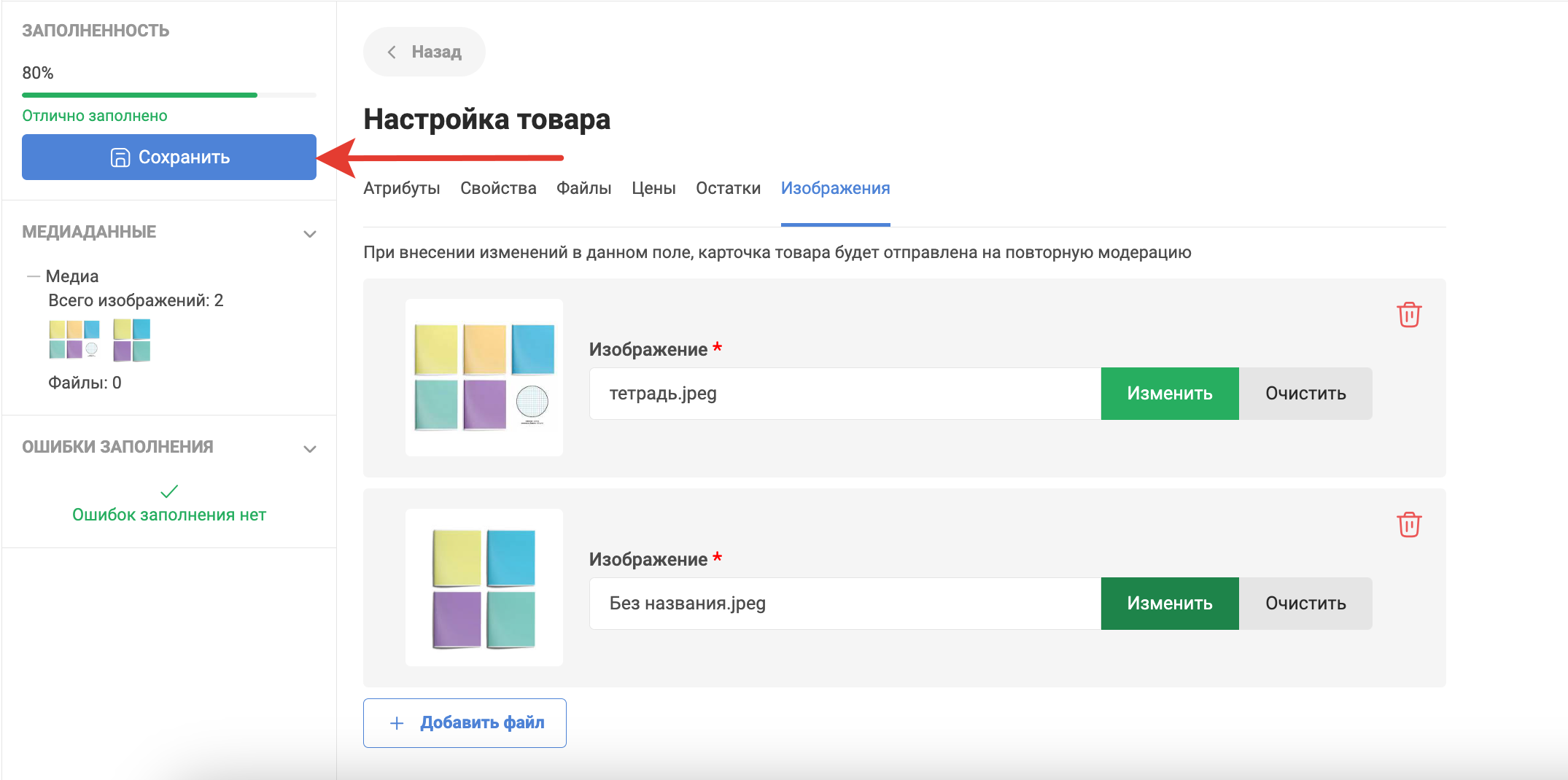 После заполнения всех необходимых полей нужно нажать кнопку Сохранить, чтобы товар был добавлен в каталог.