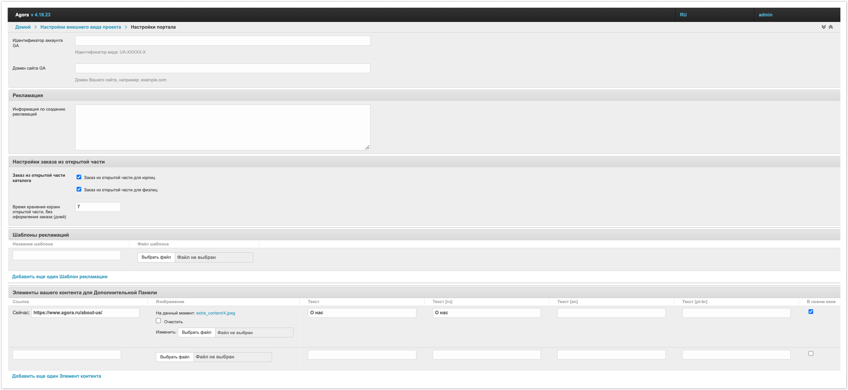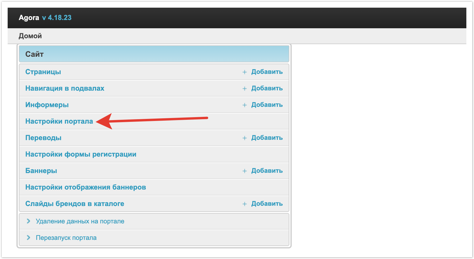 Для того, чтобы выполнить необходимые настройки платформы нужно перейти в раздел Настройки портала в панели администратора.