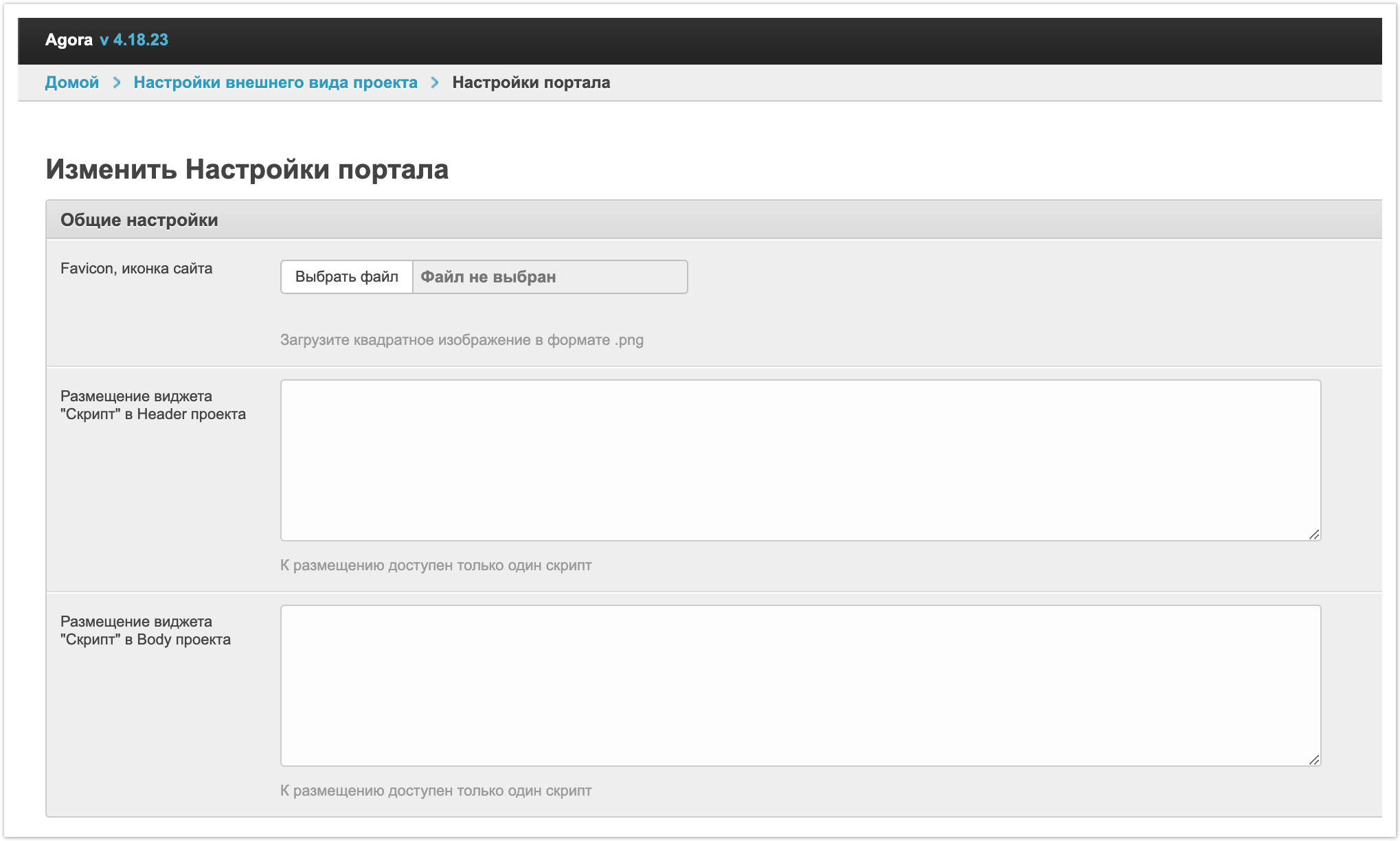 Размещение виджета "Скрипт" в Header проекта и Размещение виджета "Скрипт" в Body проекта - в этих полях можно прописать текст скрипта в header или в body, если это требуется для сторонних виджетов и приложений. Скрипт размещается на всех страницах платформы AGORA. Возможно размещение только по одному скрипту в каждое поле. Установленные скрипты запускаются в следующей последовательности: сначала header, потом body.