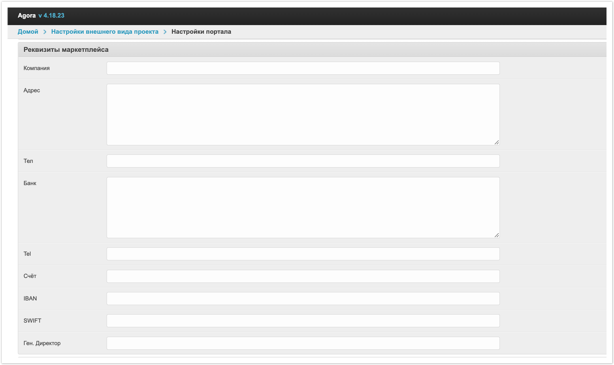 В этом блоке при необходимости можно заполнить различные реквизиты компании: Компанию, Адрес, Телефон, Банк, Счет, IBAN, SWIFT, Ген.директора. Эти данные в основном используются для внутреннего пользования.