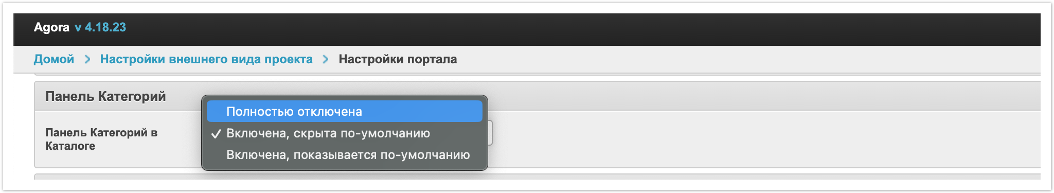 Панель Категорий в Каталоге - в выпадающем списке также три значения: Полностью отключена, Включена и скрыта по-умолчанию, Включена и показывается по-умолчанию. В зависимости от выбранного значения панель категорий в каталоге товаров будет скрыта или отображена.