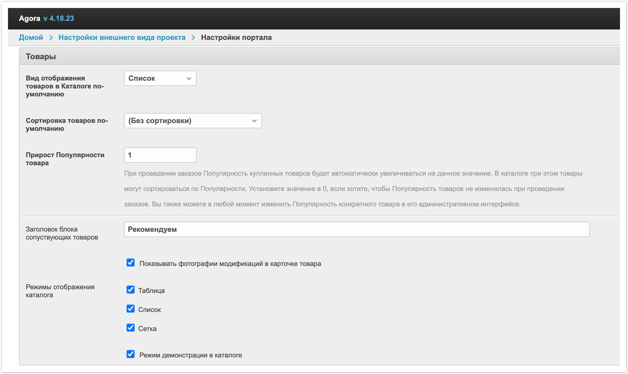 Режимы отображения каталога - эта настройка также имеет три варианта отображения: Таблица, Список, Сетка. Настройка регулирует какие режимы отображения будут доступны пользователям для выбора в каталоге товаров.