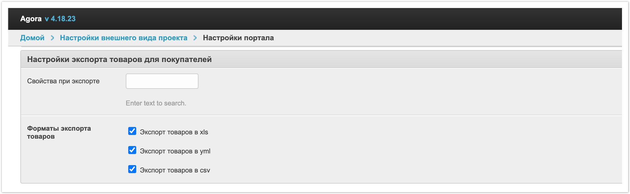 Форматы экспорта товаров - эта настройка позволяет выбрать те форматы экспорта товаров, которые должны быть доступны для покупателей в личном кабинете.