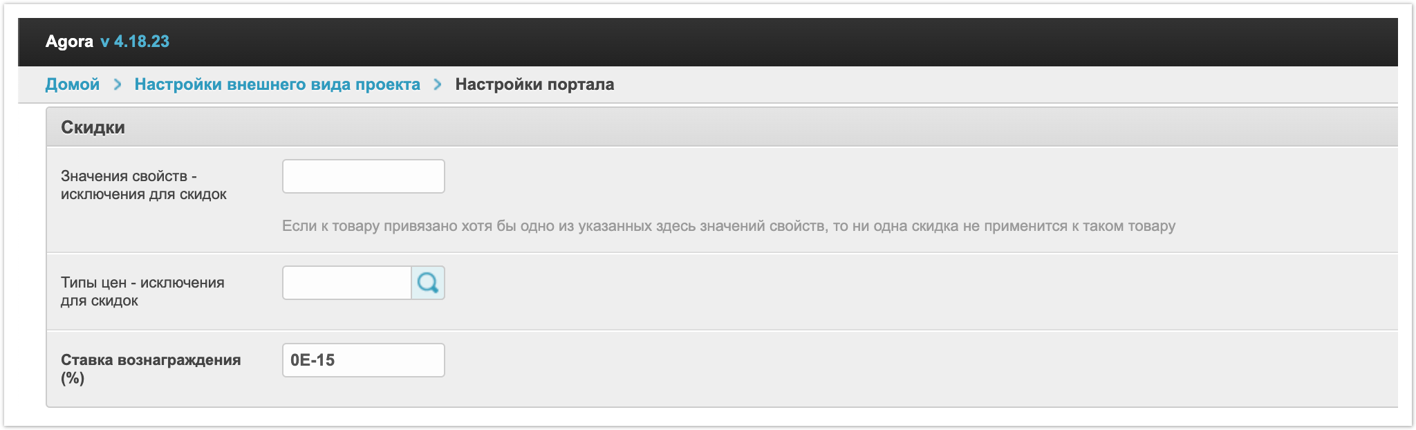 Значение свойств исключения для скидок - в этом поле можно выбрать значения свойств, которые будут исключать товар из действия скидки. То есть если товар имеет хотя бы одно из указанных в этом поле значений свойств, то скидка на него не будет применяться.