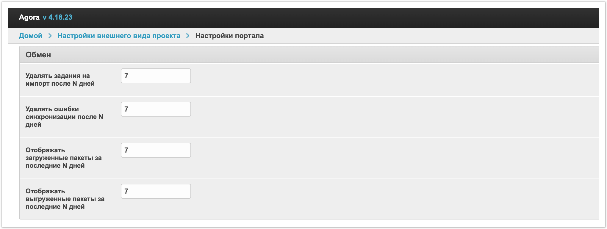 Отображать выгруженные пакеты за последние N дней - указывается количество дней, после которого происходит удаление пакетов экспорта. Эти данные отображаются в административной панели, раздел Пакеты обмена Экспорт.