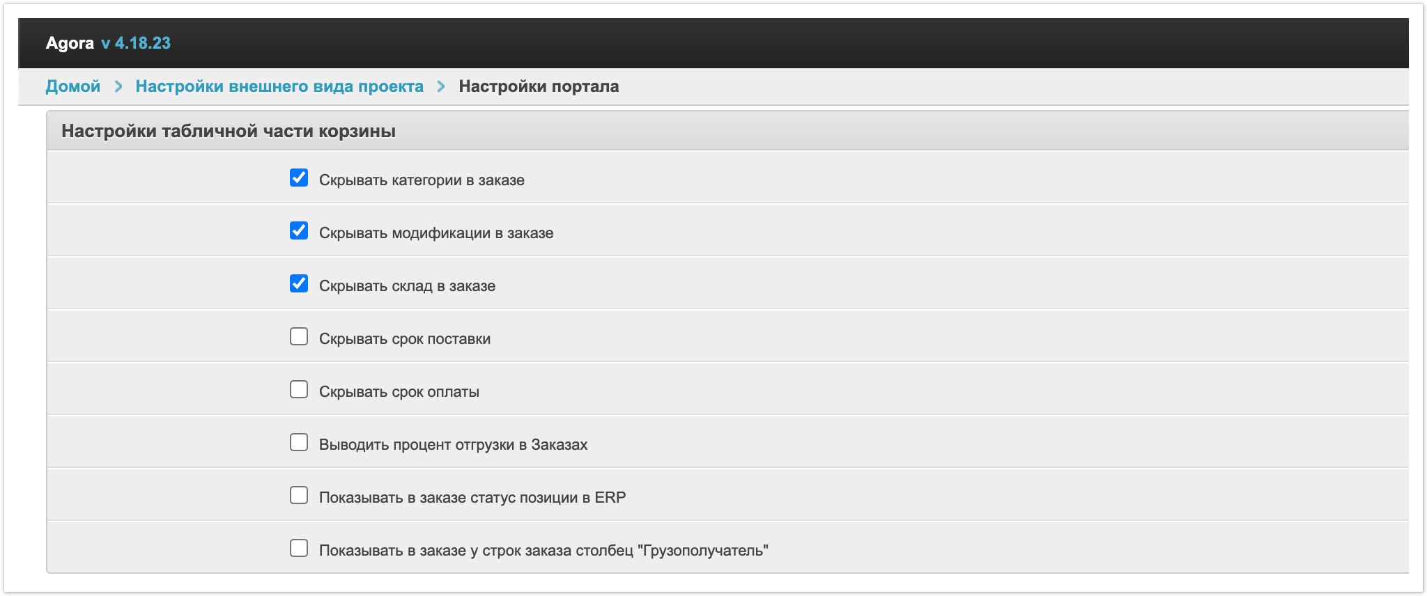 Скрывать категории в заказе, Скрывать модификации в заказе, Скрывать склад в заказе, Скрывать срок поставки, Скрывать срок оплаты - эти настройки позволяют скрыть определенные данные из карточки заказа в Корзине и в разделе Заказы.