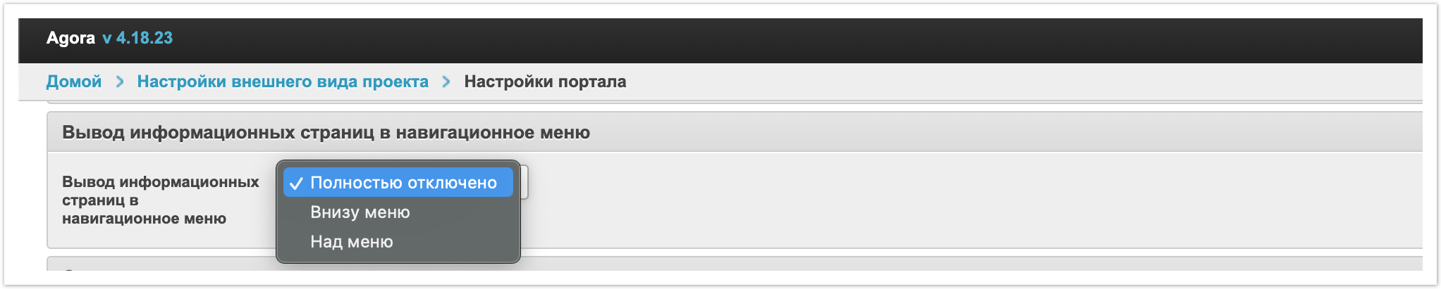 Вывод информационных страниц в навигационное меню - в выпадающем списке есть три значения: Полностью отключено, Внизу меню, Над меню. Выбранное значение регулирует, где именно будет располагаться блок Информация.