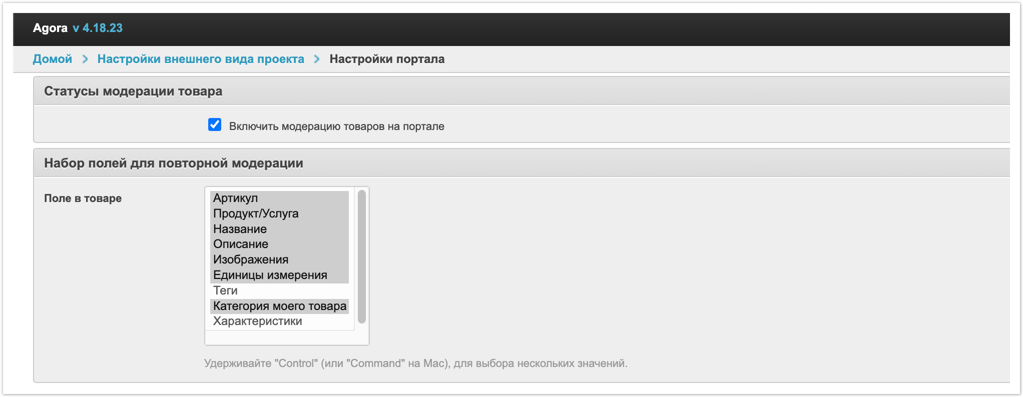 Поля в товаре - в этой настройке можно выбрать набор полей для повторной модерации, то есть если по одному из выбранных полей для товара произойдут изменения, то он будет отправлен на повторную модерацию.