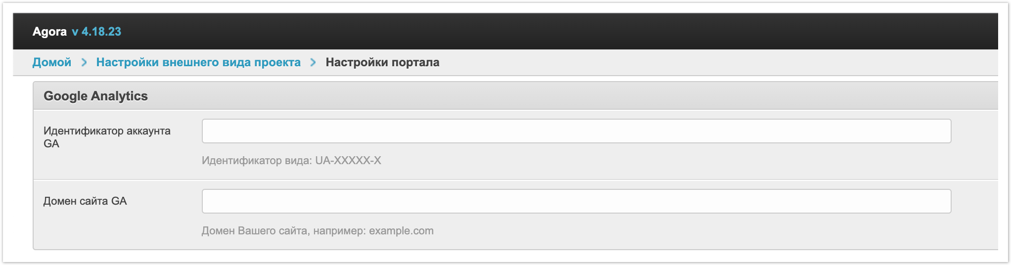 В этом разделе настраивается отслеживание статистики посещаемости сайта с помощью Google Analytics. Здесь необходимо указать Идентификатор аккаунта Google Analytics и Домен сайта GA.