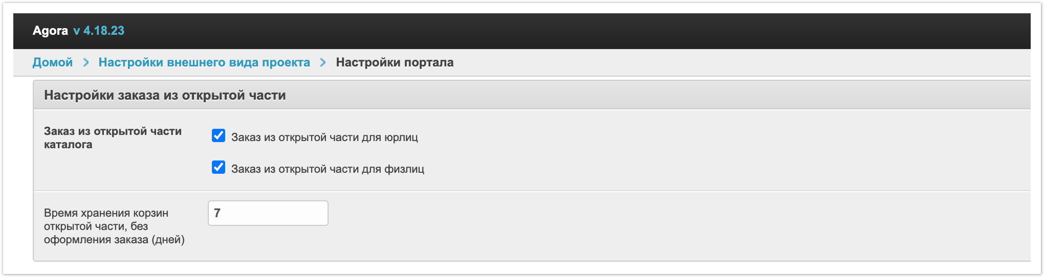 Заказ из открытой части каталога - эта настройка регулирует возможность оформить заказ без регистрации для юридических и физических лиц.
