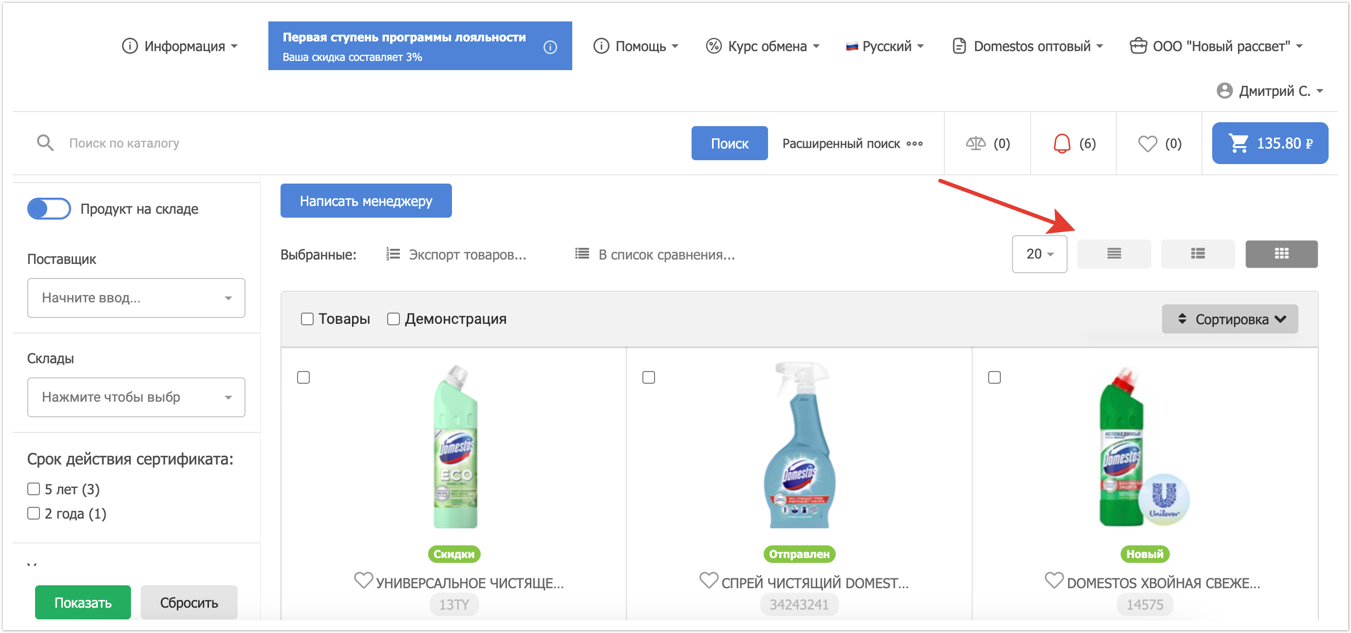 Вид отображения товаров в каталоге по-умолчанию - в выпадающем списке есть 3 значения: Таблица, Список, Сетка. В зависимости от выбранного значения товары в каталоге в личных кабинетах пользователей будут принимать заданный вид отображения. При необходимости пользователь может изменить вид отображения каталога в своем личном кабинете вручную.