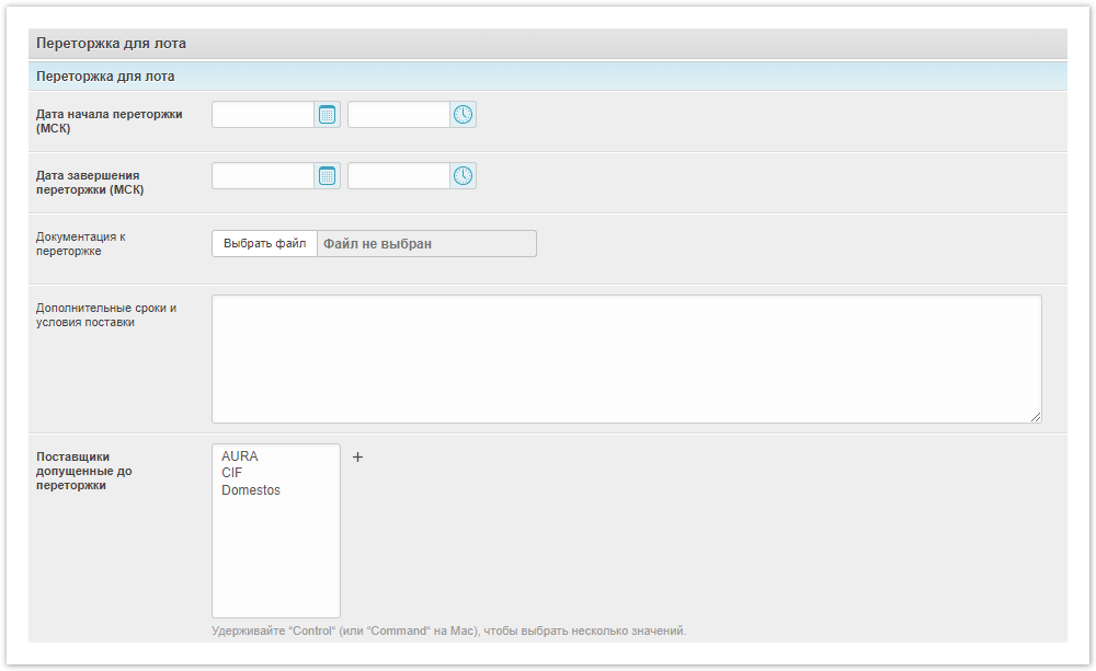 Переторжка для лота (данные заносятся при запуске переторжки).